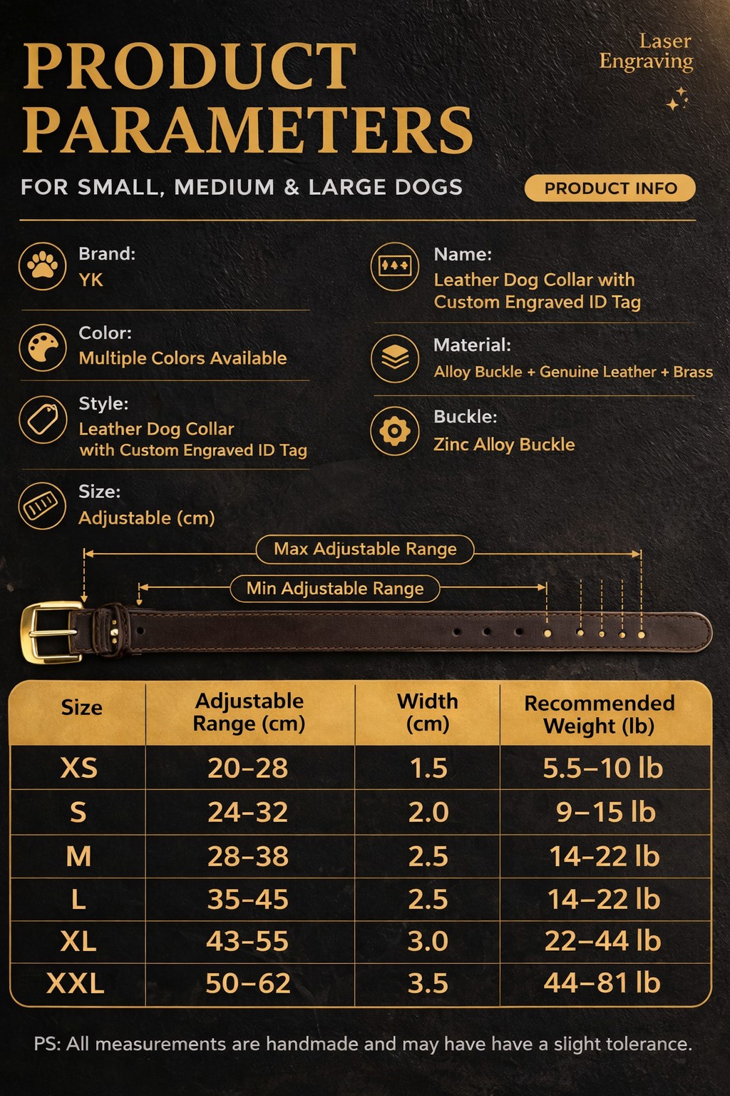 Crafted from premium leather and paired with a solid brass engraved ID tag, this personalized dog collar combines durability with timeless style. The adjustable design ensures a comfortable fit for small, medium, and large dogs. Customize your pet’s name and phone number to keep them safe while adding a unique touch. Perfect for daily wear, this collar offers both functionality and elegance, making it an ideal choice for pet owners who value quality and personalization. Please note: Customized products are not eligible for return or refund. If there is any quality issue, please contact our customer service within 7 days…