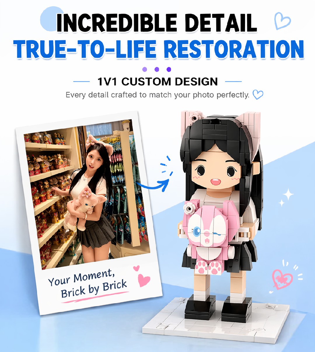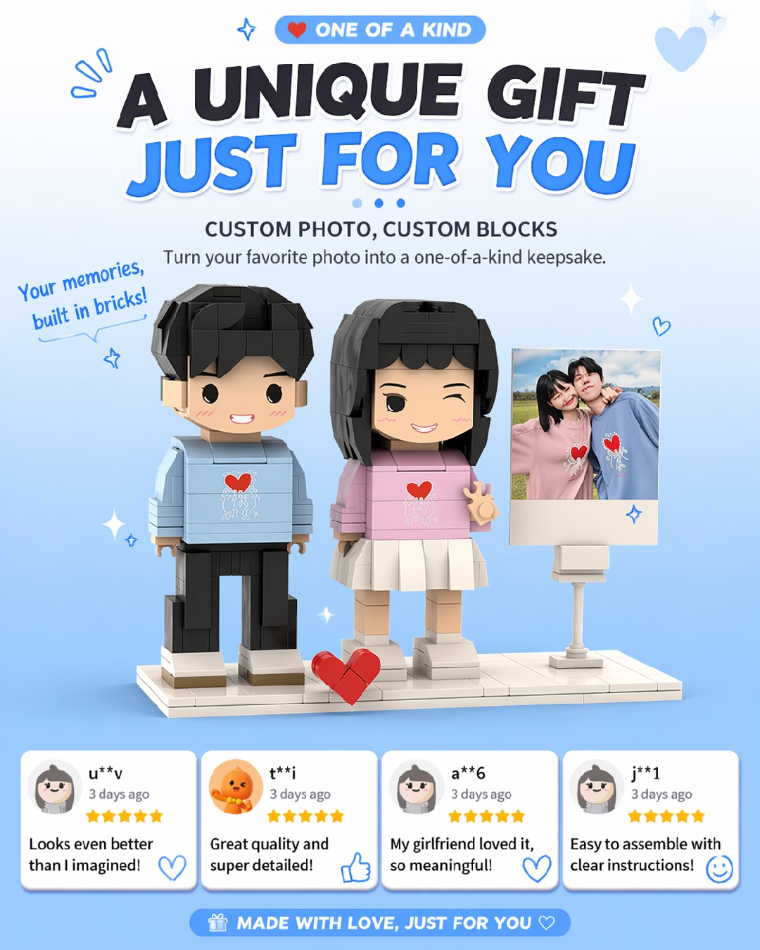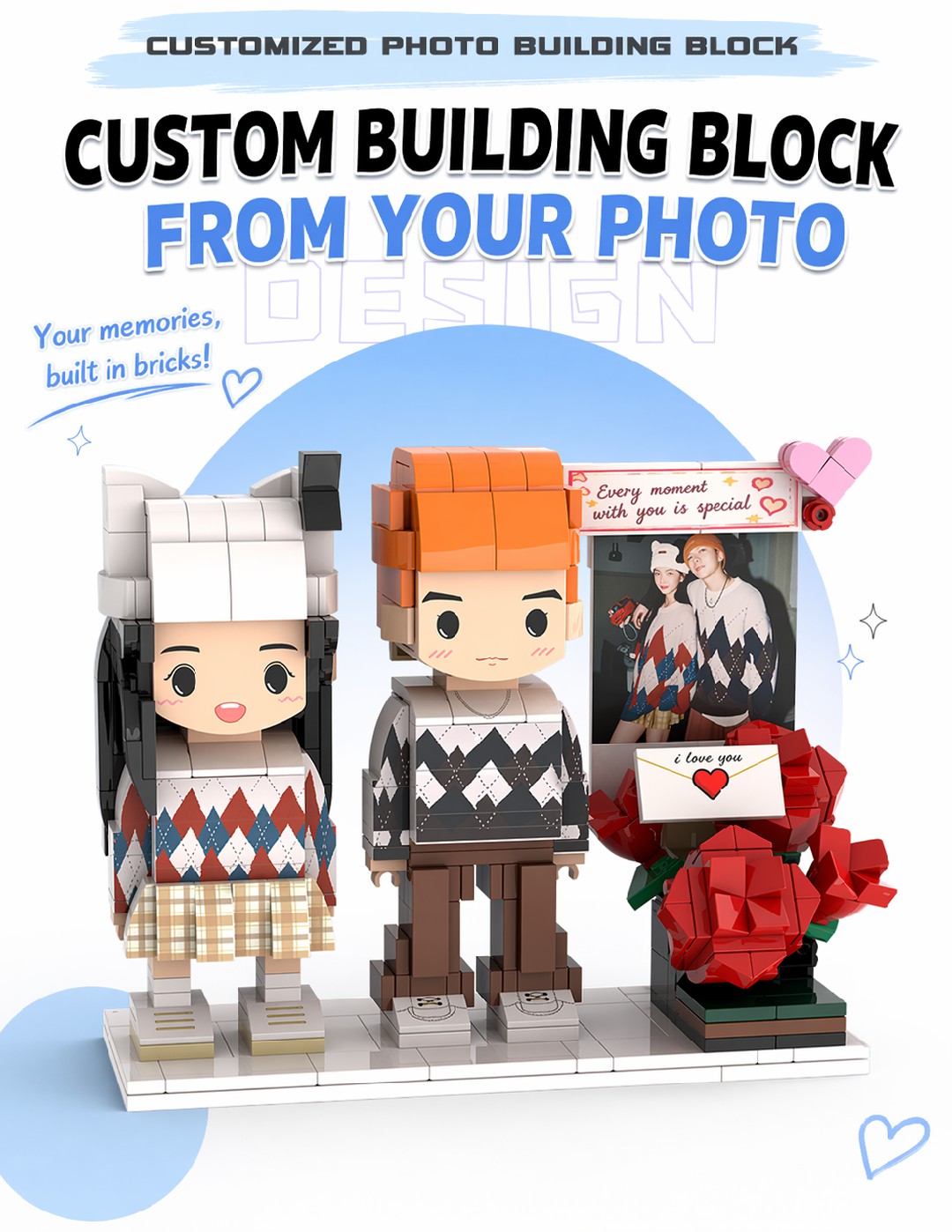 Create personalized brick figures based on your photos, capturing your unique style and special moments. Perfect for personal keepsakes or romantic couple gifts, celebrating love in a fun and creative way. As this is a customized product, returns are not accepted. If there is any quality issue, please contact our customer service within 7 days after delivery for a replacement.