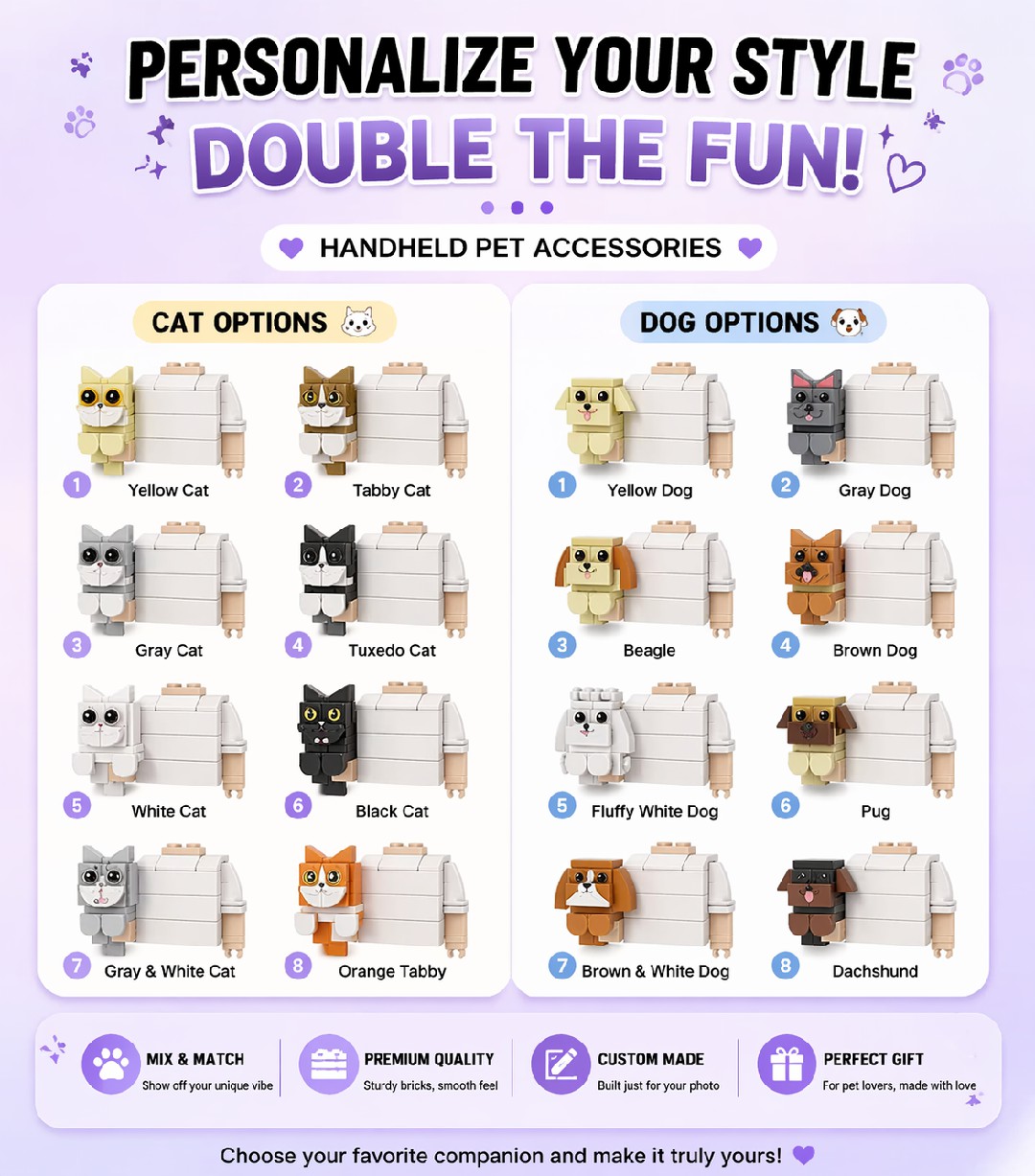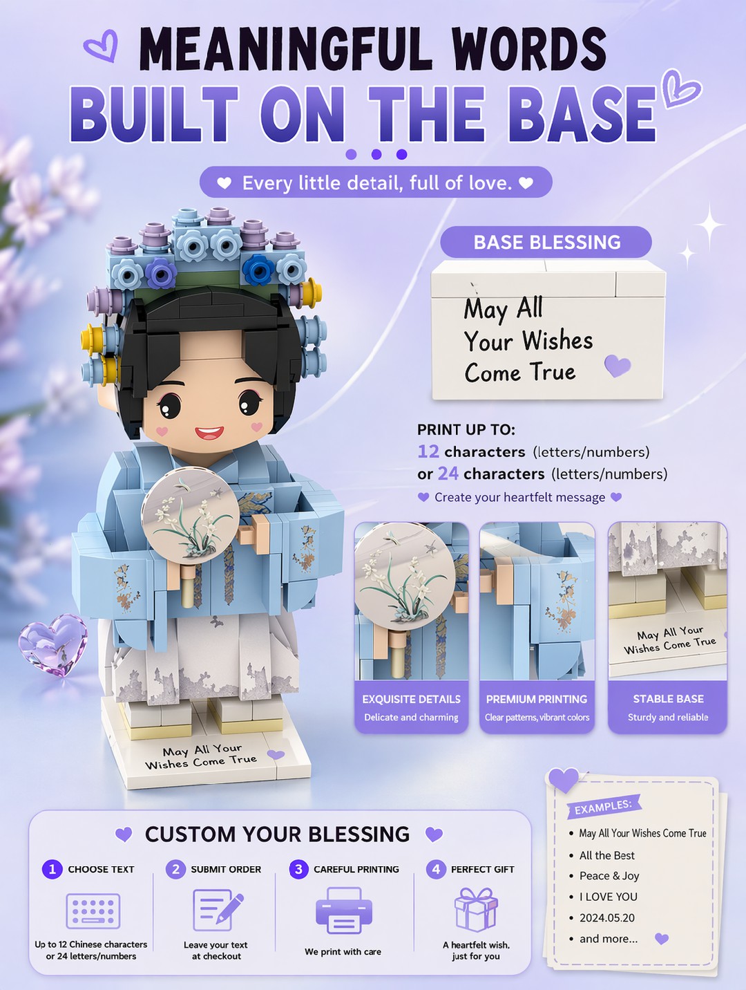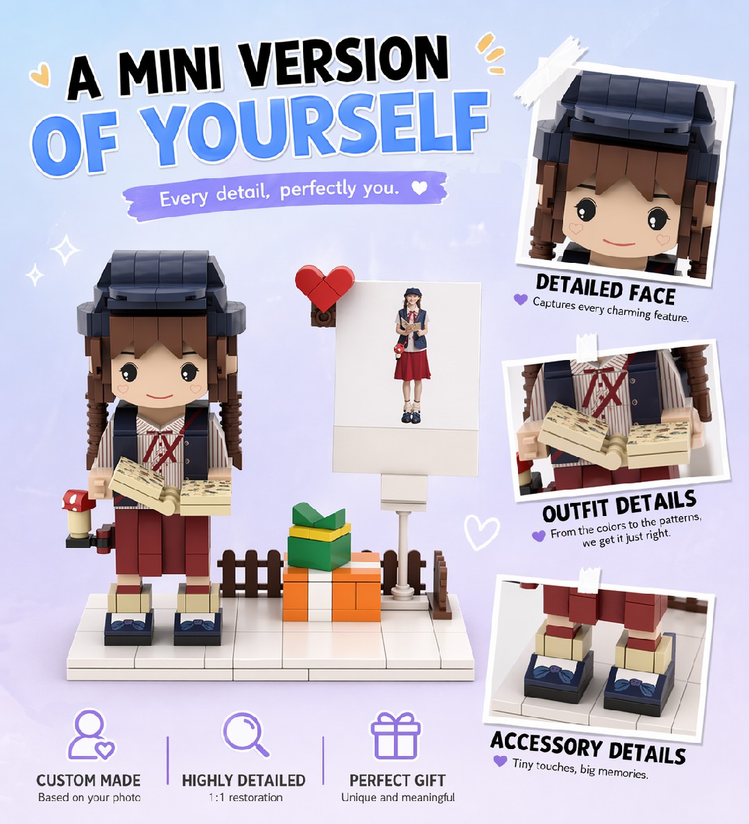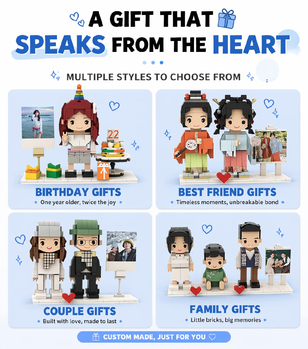 Create personalized brick figures based on your photos, capturing your unique style and special moments. Perfect for personal keepsakes or romantic couple gifts, celebrating love in a fun and creative way. As this is a customized product, returns are not accepted. If there is any quality issue, please contact our customer service within 7 days after delivery for a replacement.
